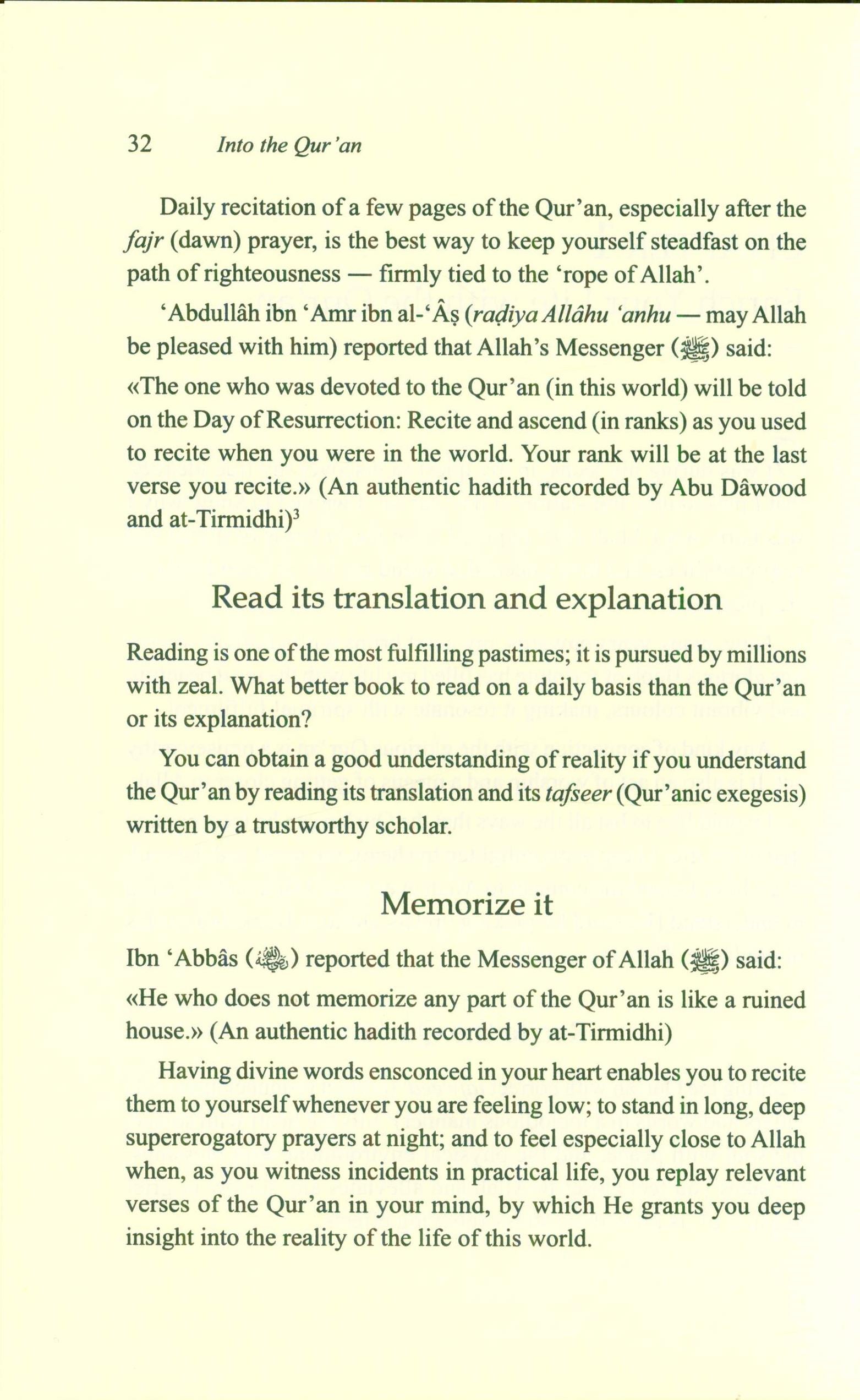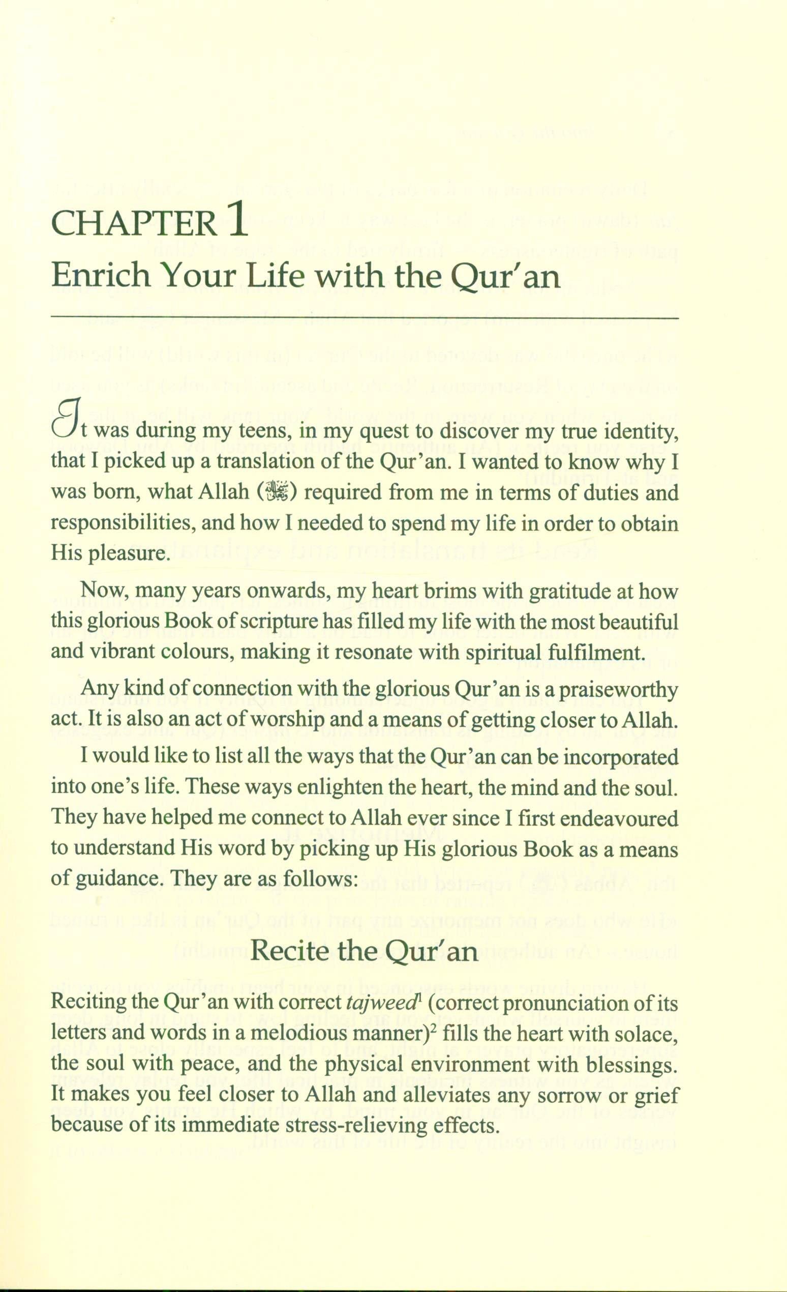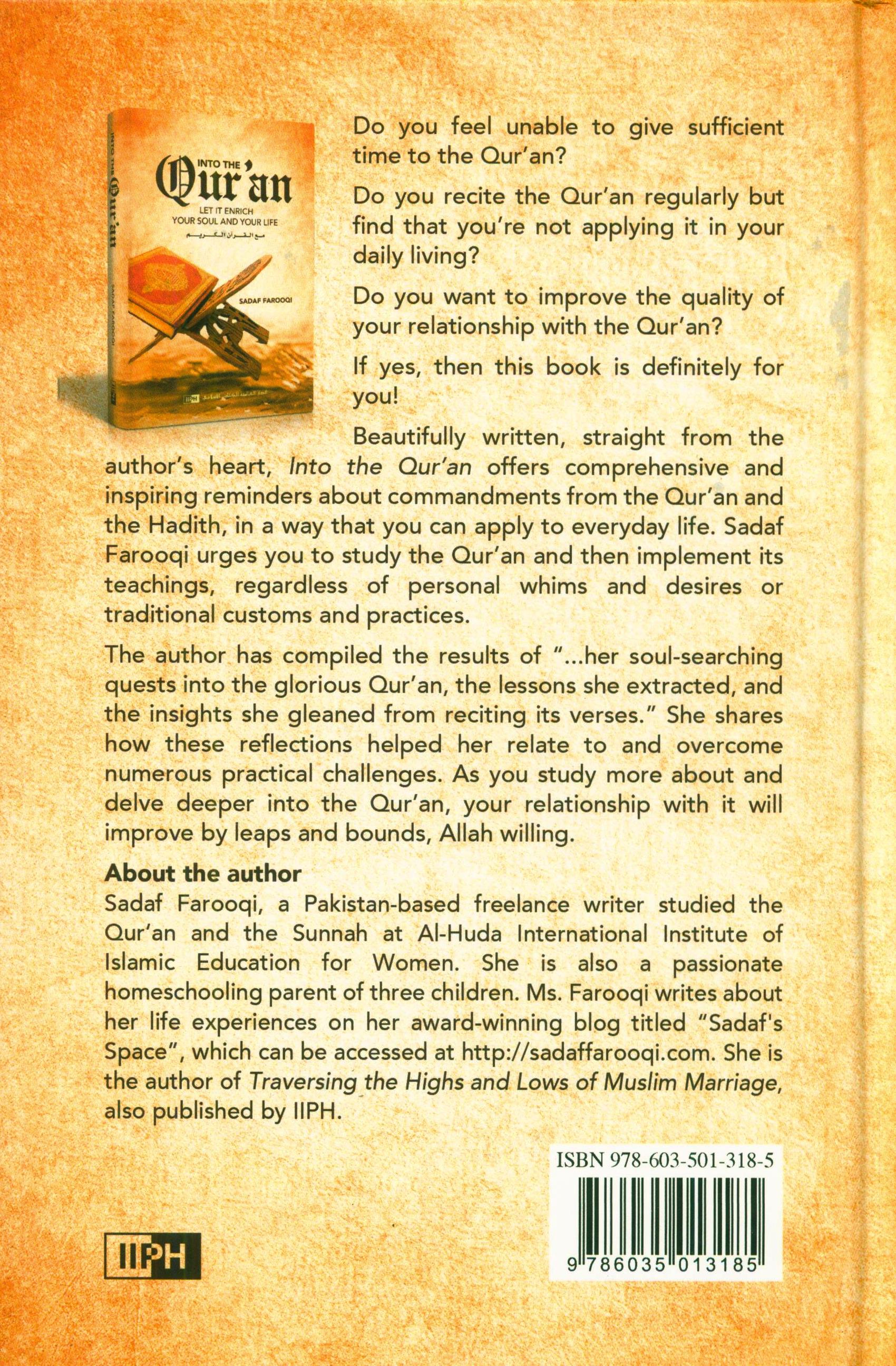Beautifully written, straight from the author's heart, Into the Qur'an offers comprehensive and inspiring reminders about commandments from the Qur'an and the Hadith, in a way that you can apply to everyday life. Sadaf Farooqi urges you to study the Qur'an and then implement its teachings, regardless of personal whims and desires or traditional customs and practices.