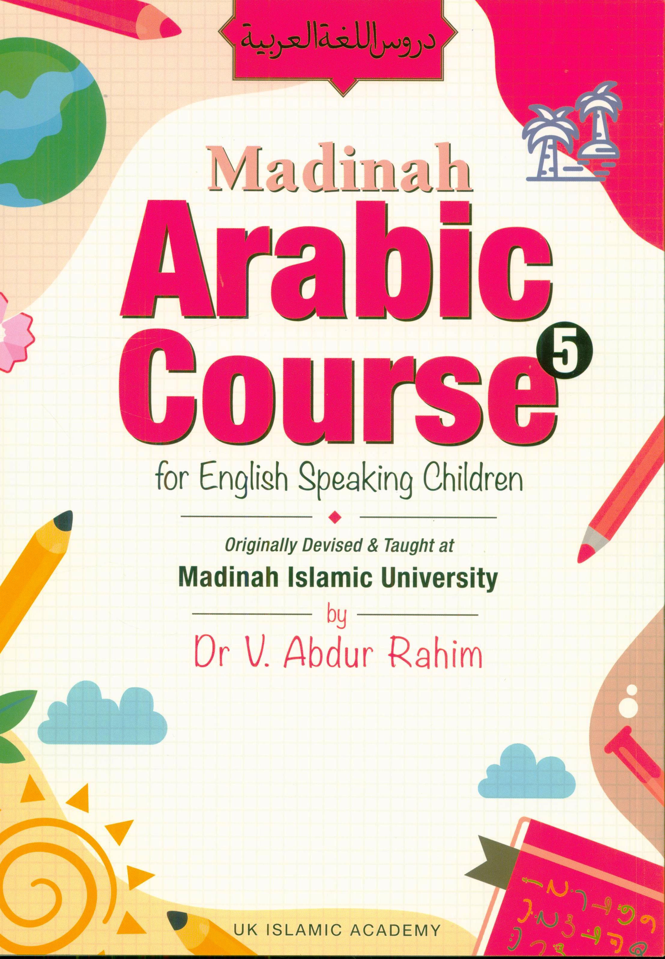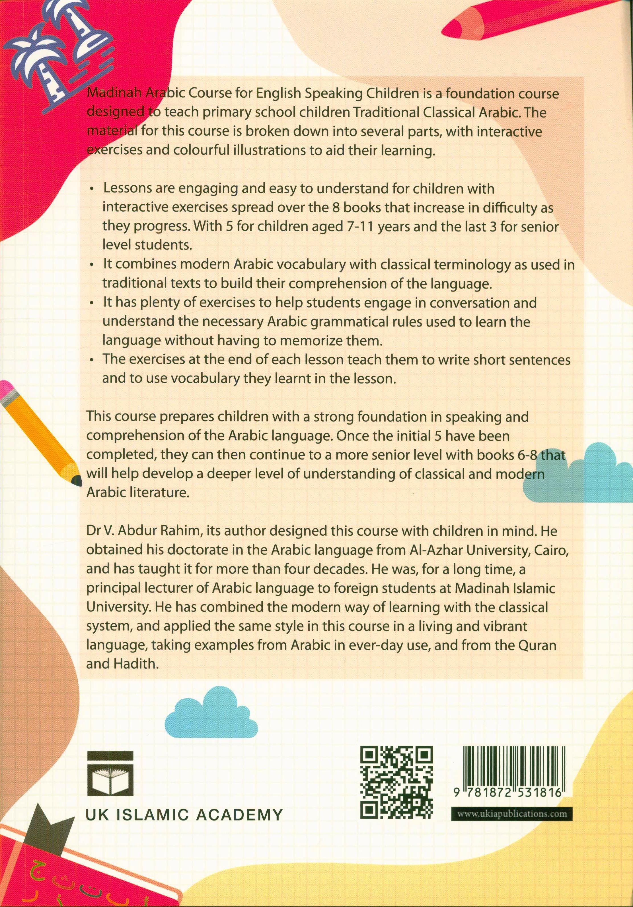 Madinah Arabic Course for English Speaking Children Book 5 of 5. This is a foundation course designed to teach school children Traditional Classical Arabic. The material for this course is broken into several parts, with interactive exercises and colourful illustrations to aid their learning.