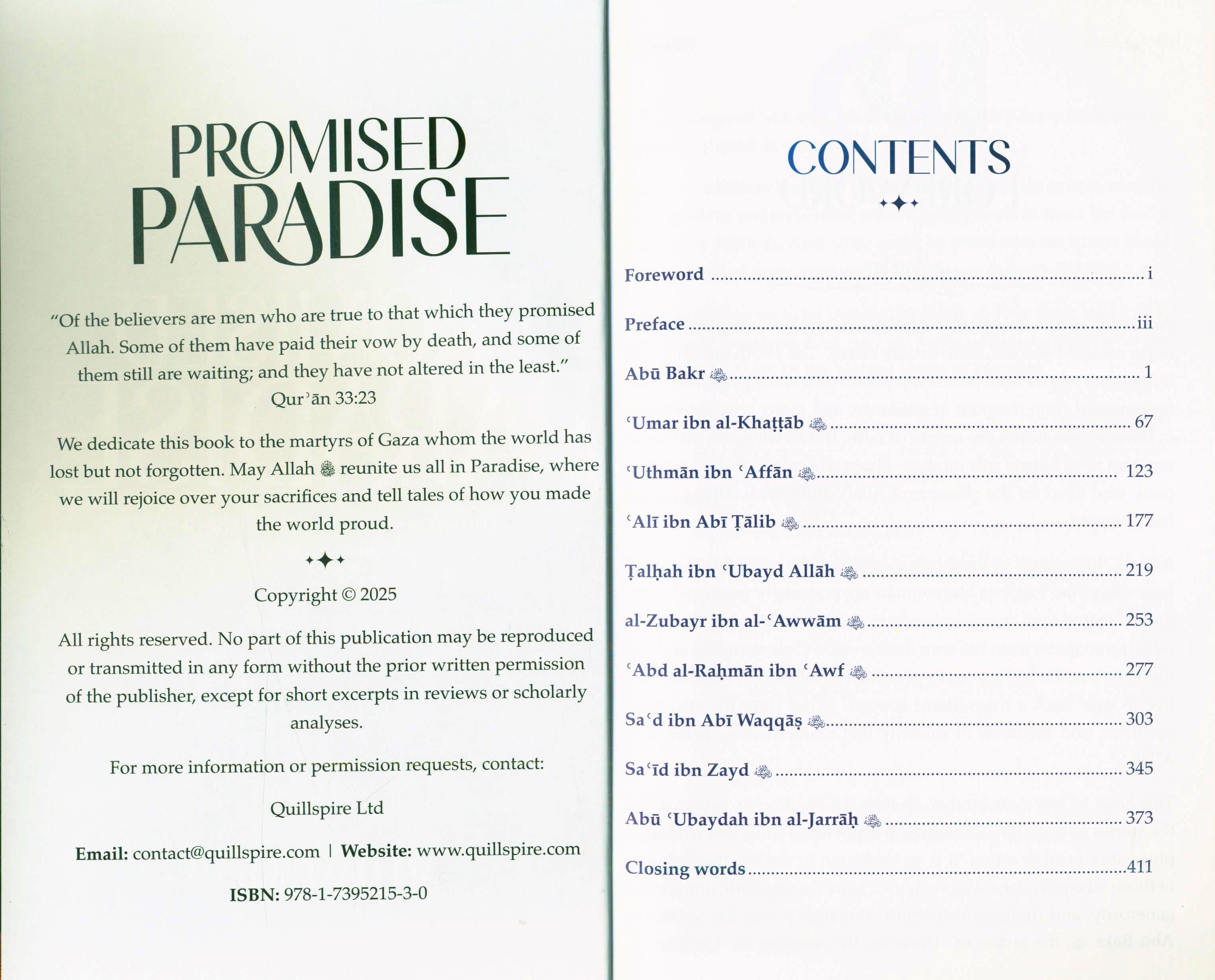 Promised Paradise by Sh Ali Hammuda takes you on an inspiring journey through the lives of the ten blessed companions of Prophet Muḥammad ﷺ who were promised Paradise during their lifetime. What set these extraordinary individuals apart? What qualities earned them such an honour from Allah? Through vivid storytelling and profound insights, Sh Ali Hammuda explores their sacrifices, faith, and unwavering commitment to Islam. This book invites you to reflect, emulate their virtues, and strive for the ultimate goal: earning your place in Paradise.