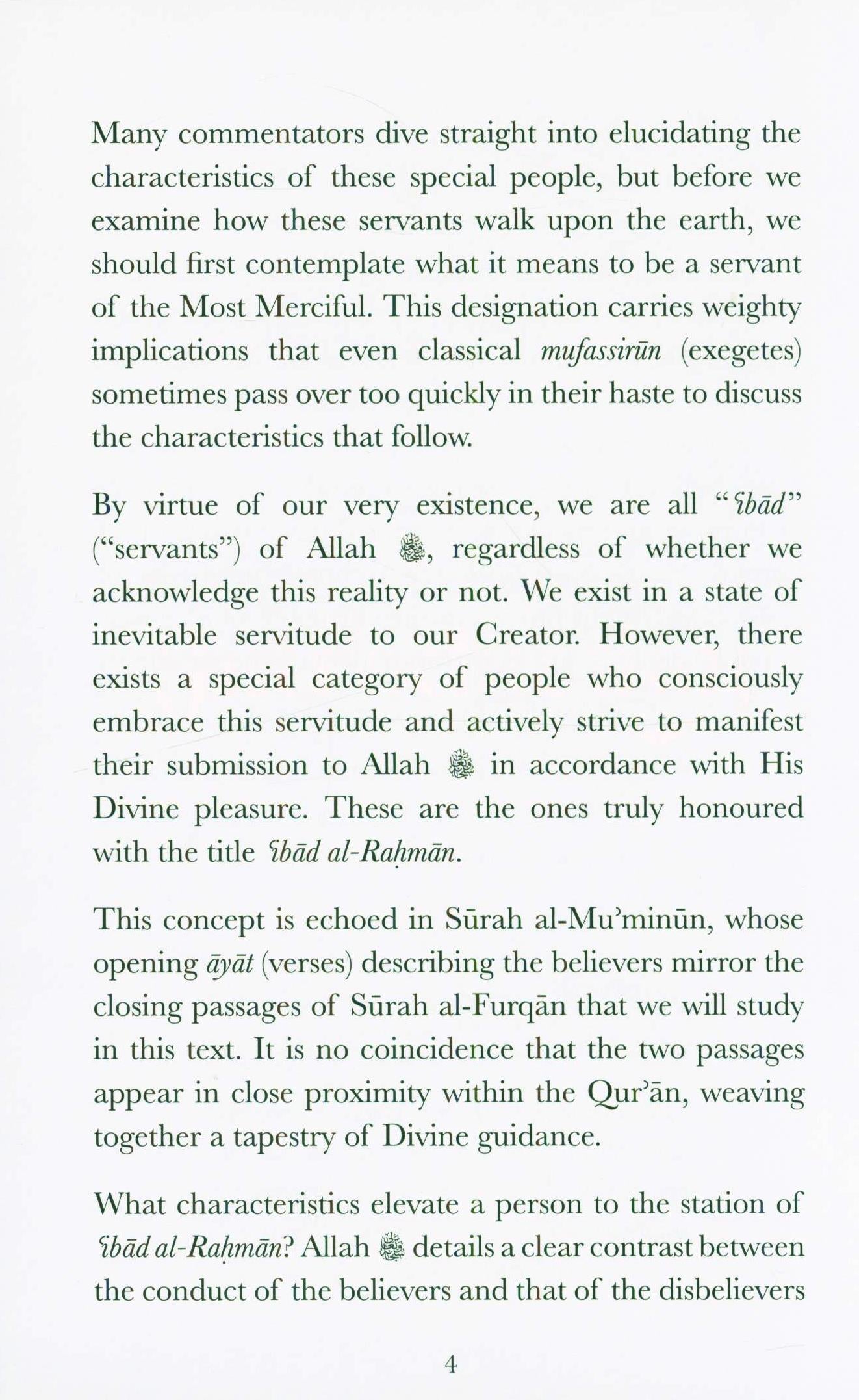 One of the most beautiful portions of the Qur’an describes a detailed manual for how a believer should live their life. How one becomes Ibadur Rahman, the servant of the most Merciful. It encompasses multiple elements and dimensions of worship, family life, character, reflection, and living as a community. These key qualities, if properly implemented in our lives, will allow us to become the true servants that we should all aspire to become. This book will take you on that journey to identify and implement those qualities in your life, solely for the pleasure of Allah.